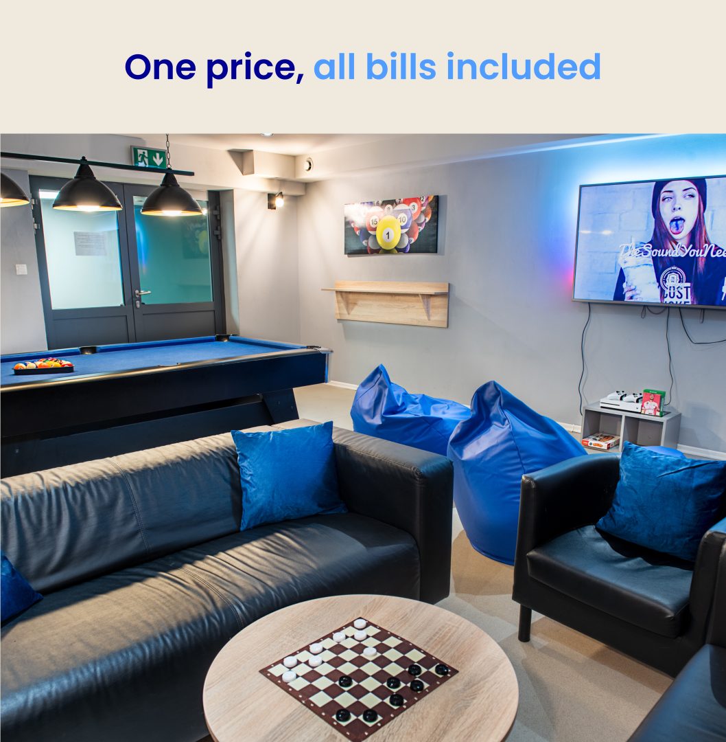 You decide — a single room, a double, or a shared space for a bigger crew. Shared kitchens, a gym, study rooms, and chillout areas with billiards, table football, and board games are waiting for you every day.
